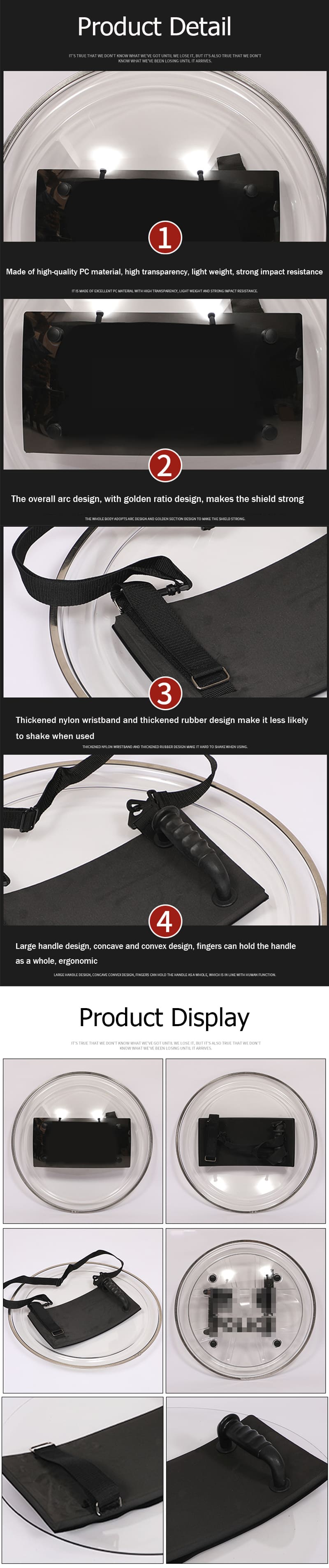 Double-Layer Thickened Arc Riot Shield is designed for close combat operations and is ideal for urban or rural riot control operations. This round riot shield is made of solid polycarbonate and has a slight dent on the edge to enhance its strength during riot control operations. The round shield helps protect against non-ballistic handheld riot threats and can be easily moved up and down or left and right to adjust the direction in which the threat may be thrown.