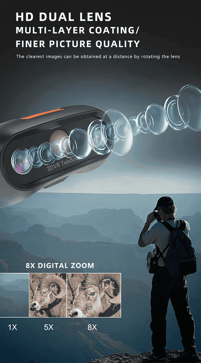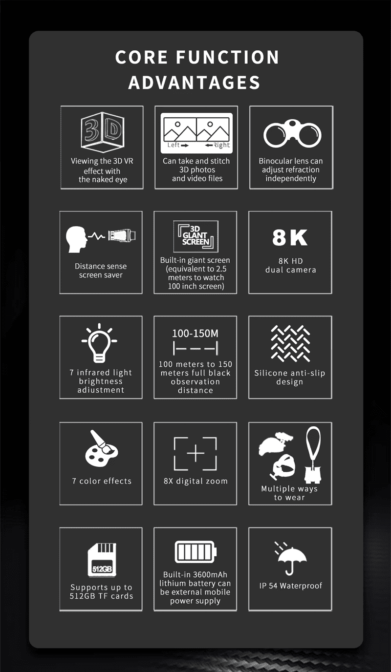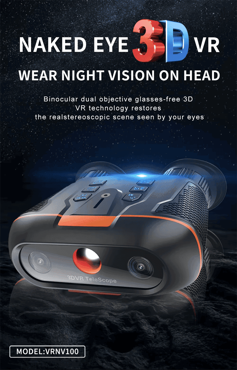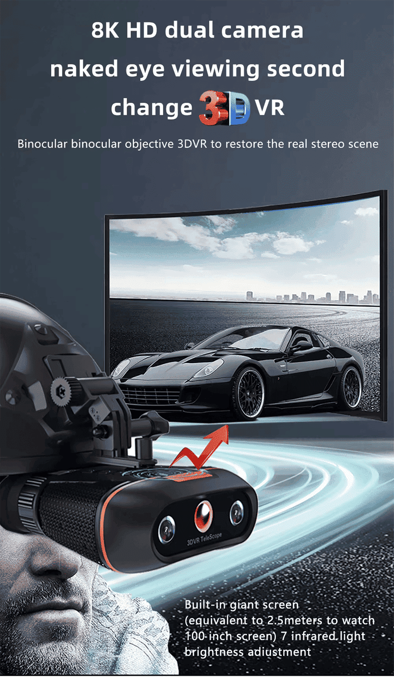 The night vision device integrates multiple functions such as naked-eye 3DVR, night vision, 8K high-definition shooting, distance sensing screen saver, and independent adjustment of binocular refraction. It is suitable for outdoor adventures, night observations, photography and other diversified scenes. It not only meets the user's ultimate pursuit of 3D vision, but also shows excellent performance and reliability in complex environments. Whether it is used for entertainment, creation, or professional observation, the device can bring unprecedented experience.