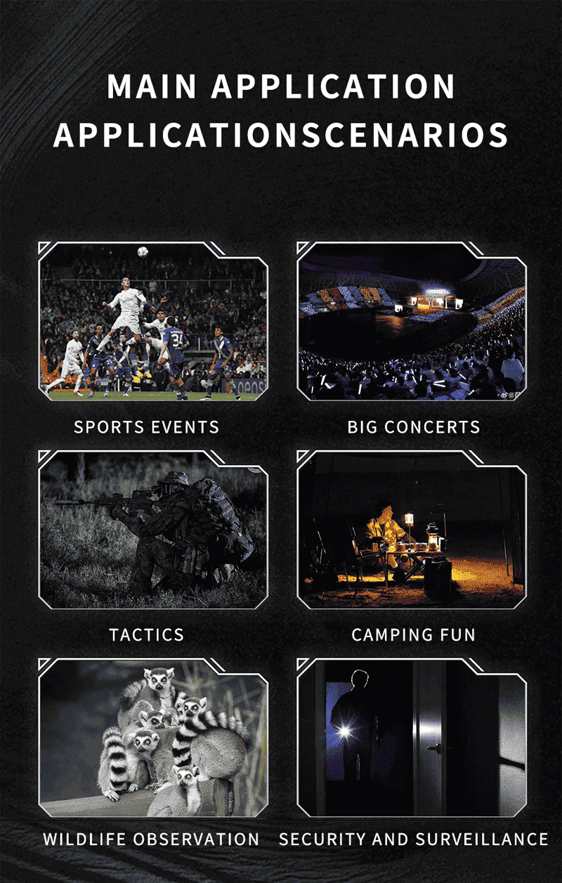Application scenarios:Sports events, large concerts, 3D film shooting, tactics, reconnaissance, hunting, security, patrol, camping fun, wildlife observation, etc