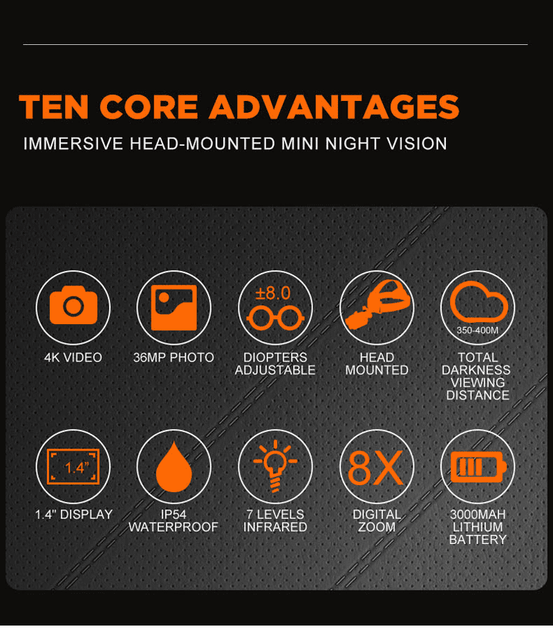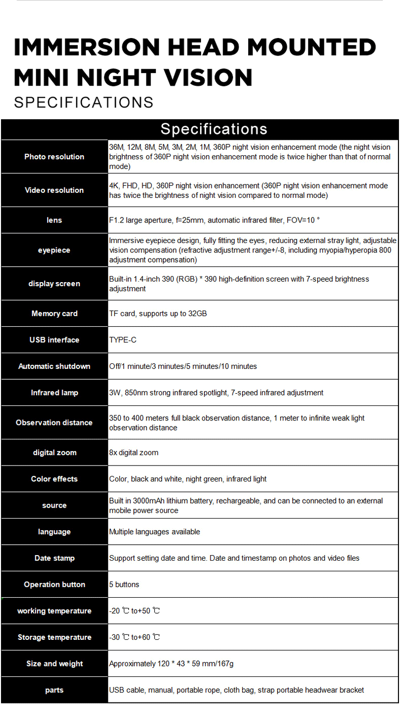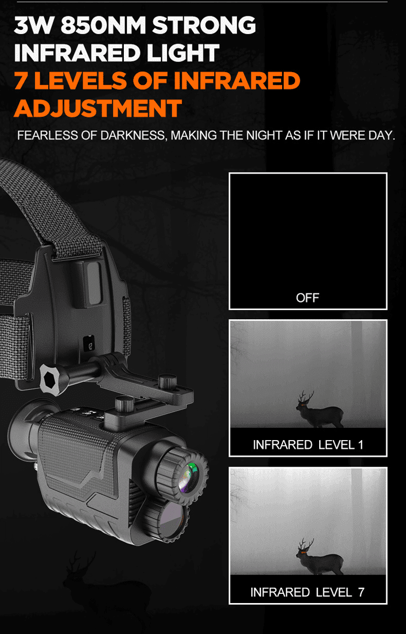 NV8260 Monocular Head-Mounted Night Vision Helmet 8x Digital Zoom Night Vision HD Infrared Telescope Outdoor Night Vision Goggles is a mini portable and powerful head-mounted night vision device that integrates high definition, long-distance observation, multiple color modes, long battery life and other functions, suitable for various night scene shooting. Its lightweight design, visual compensation function and waterproof performance further enhance the user experience and practicality.