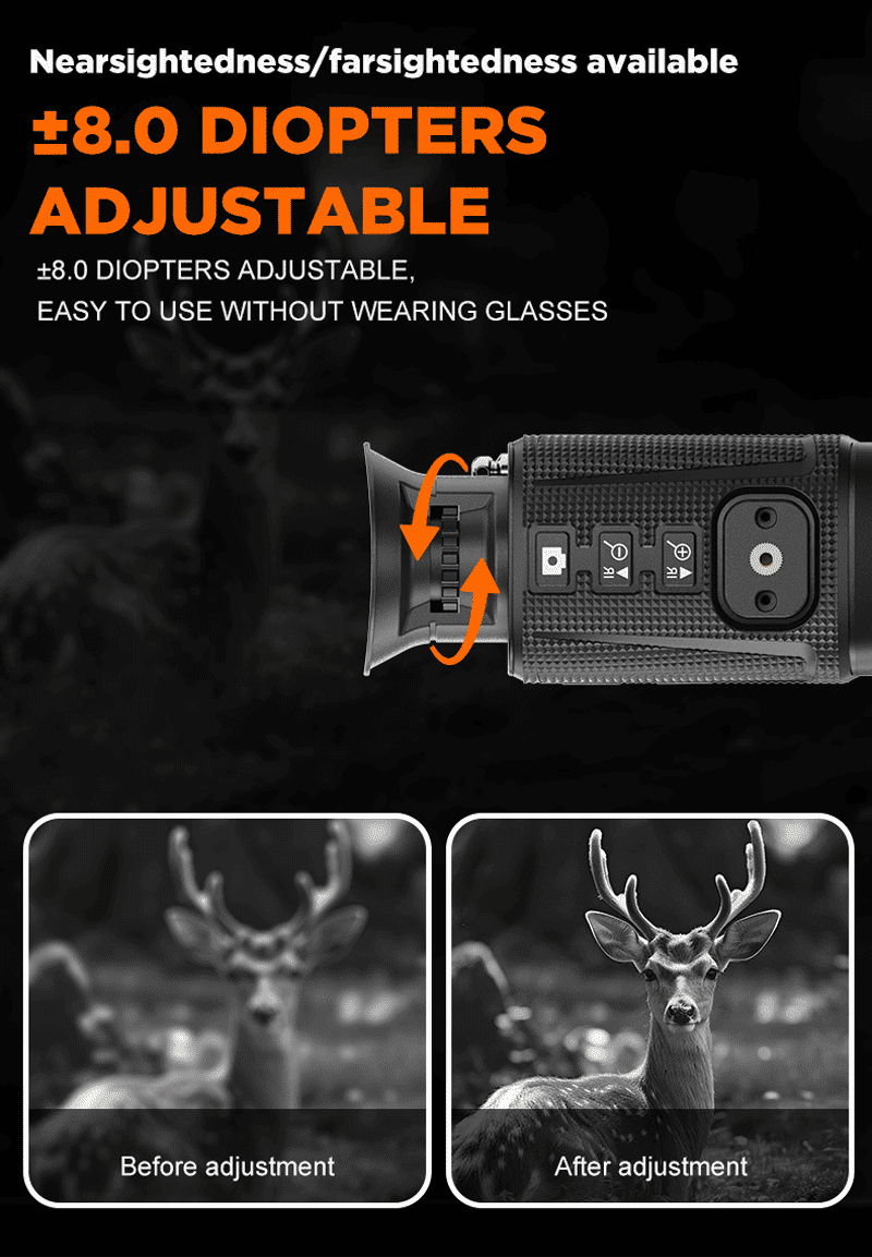 Immersive eyepiece design, completely fitting the eyes, reducing external stray light, adjustable vision compensation (refractive adjustment range+/-8, both myopia/hyperopia 800 adjustment compensation), 7x magnification