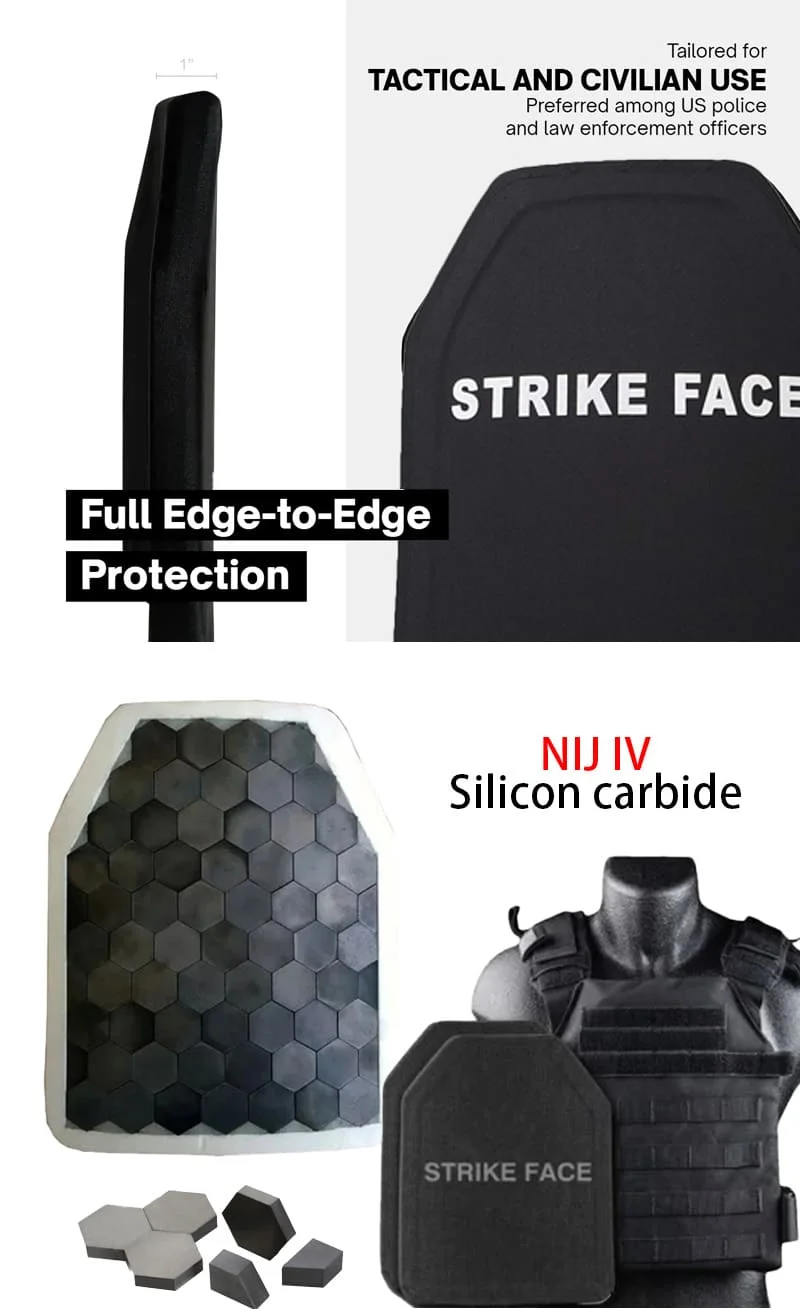 This amazing set of independent bulletproof plate bulletproof vests has a protection level of Nij IV. It consists of three layers of silicon carbide ceramic bulletproof sheets + PE soft bulletproof plates + 600 denier waterproof covers. It is seamlessly encapsulated and has the advantages of waterproof, moisture-proof, bulletproof, puncture-proof, and UV-proof. It is the best match for bulletproof vests. The bulletproof plate cover is wrapped in a durable 600 denier waterproof shell to prevent environmental damage and extend the service life of the bulletproof vest plate. The guard plate combines the strength of ceramic and PE soft bulletproof plates to create a sturdy and lightweight protection solution. Its single curve design enhances wear resistance and makes users feel comfortable wearing it for a long time.