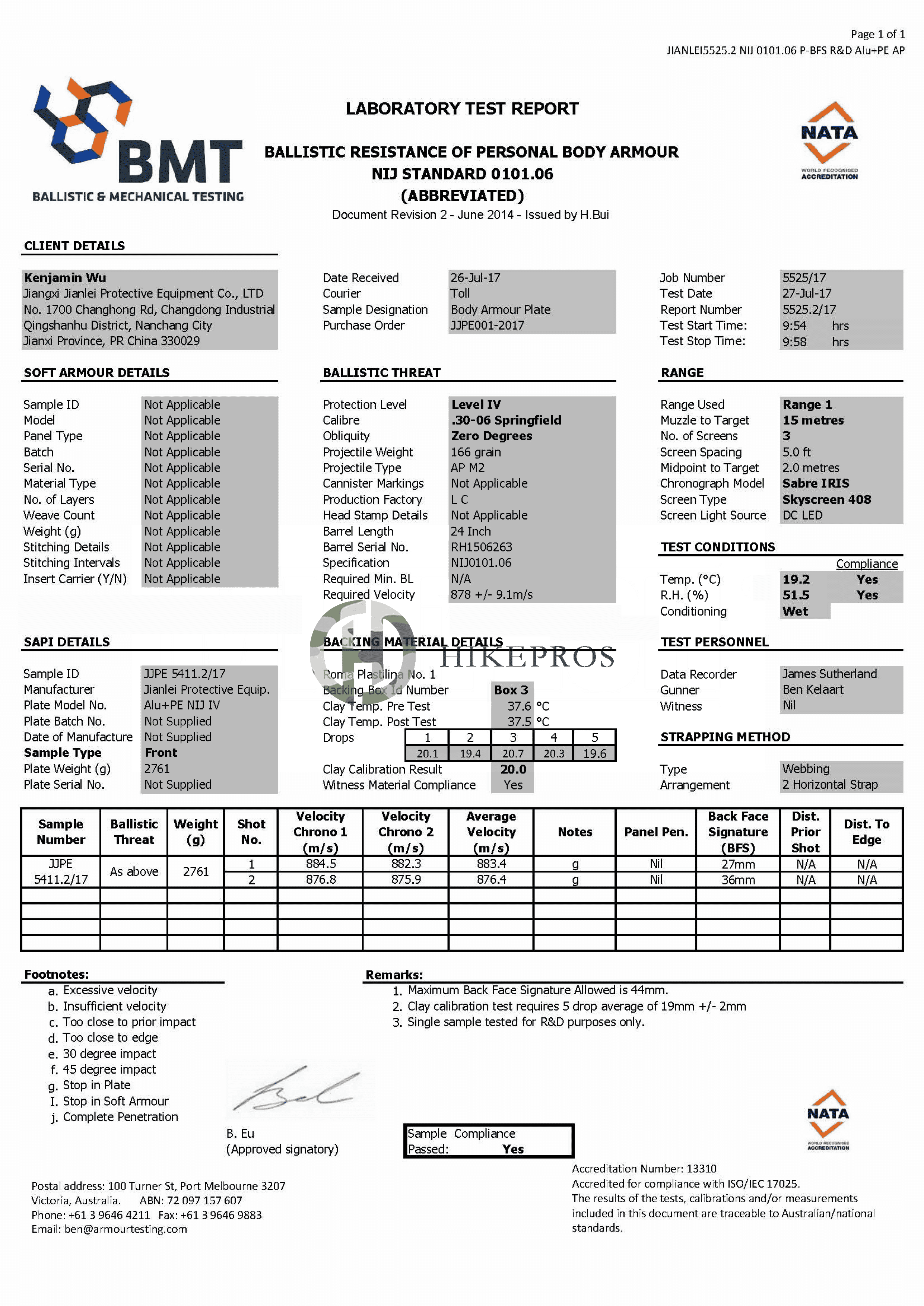 NIJ bulletproof test report