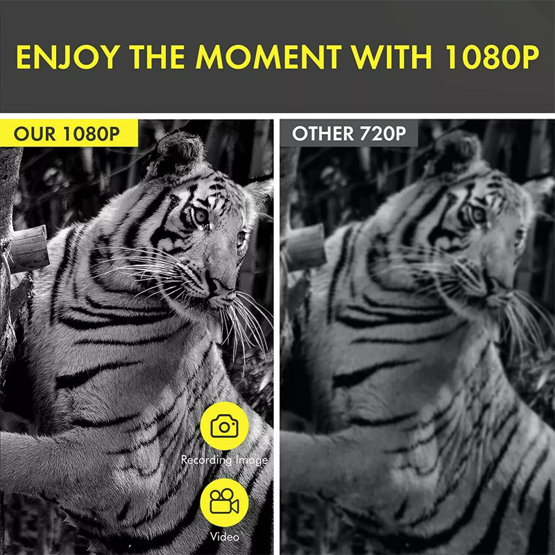 HD focus: 10x digital zoom and 25mm lens aperture, it can be easily adjusted to the best focus to observe the target in clearer details. With a good image amplifier and high-sensitivity imaging array, it can provide high-quality 1080p FHD images/videos (1920x1080p images and 1080p FHD videos at 30fps). It has a 1.5-inch TFT screen for easy and instant photo viewing