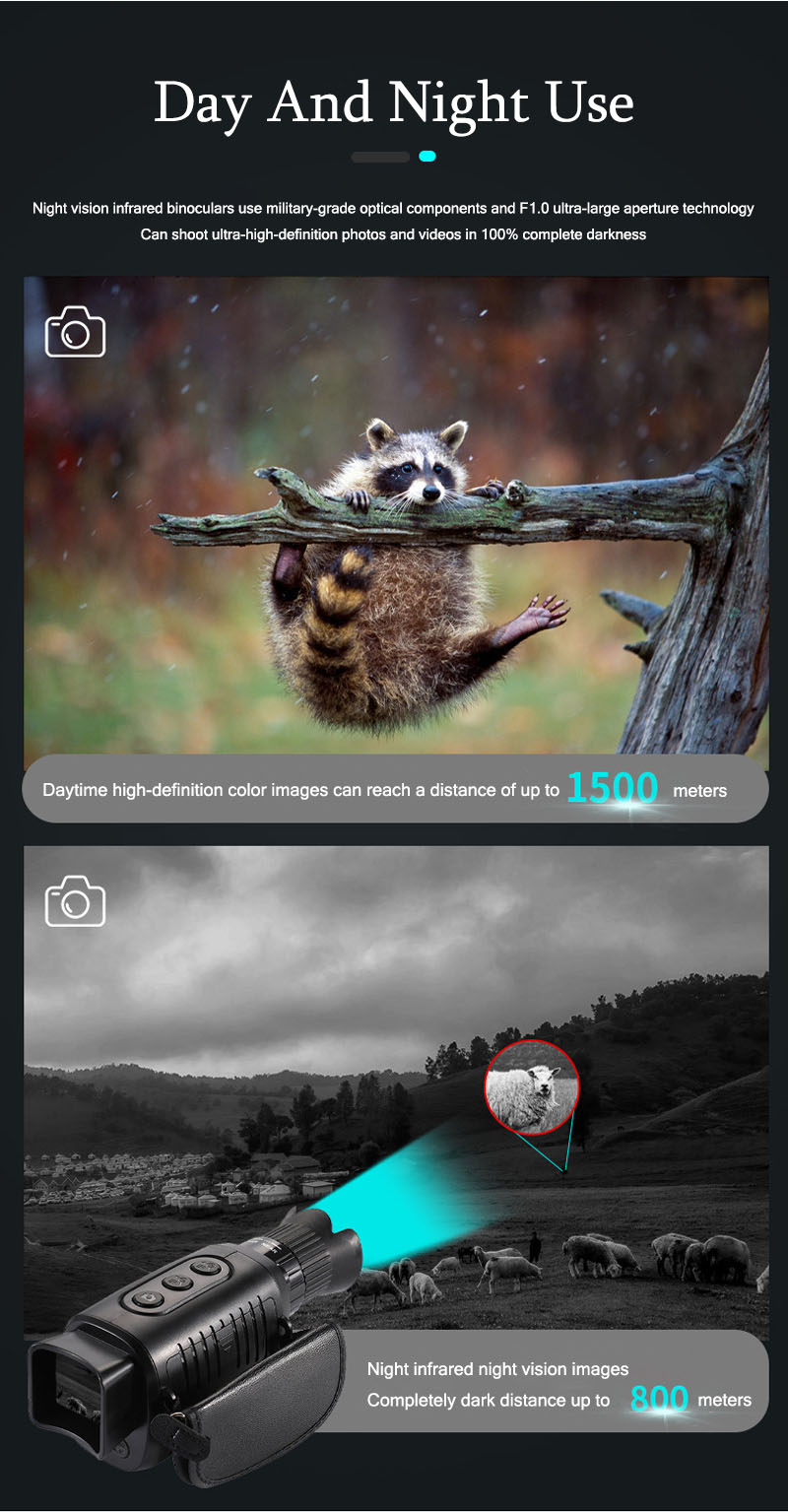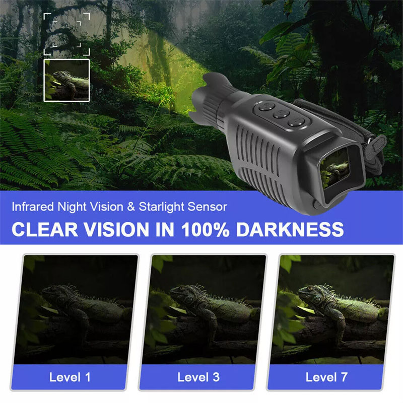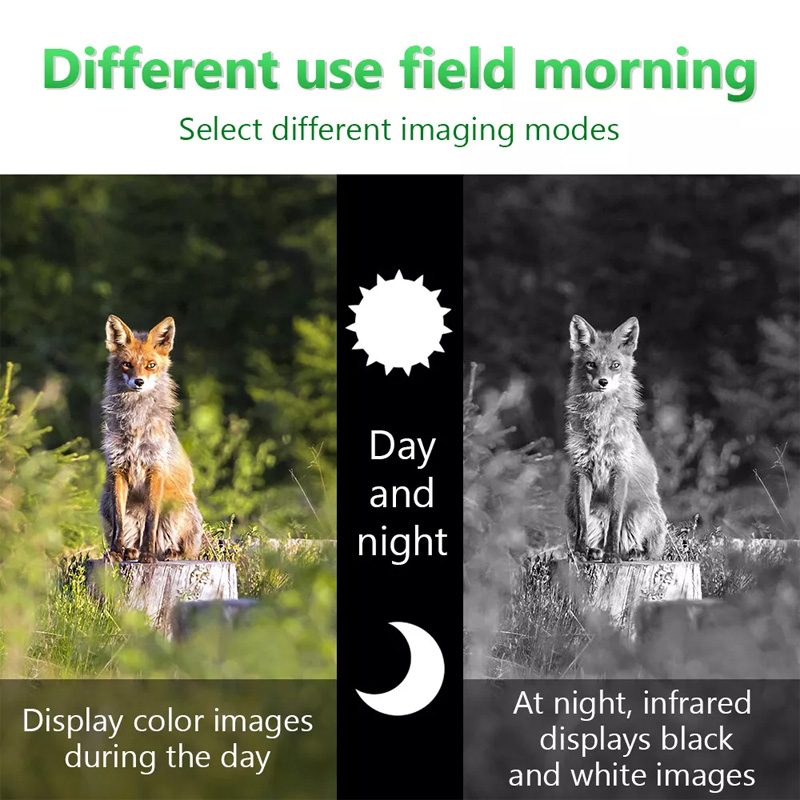 High-resolution night vision glasses: The night vision monocular has an infrared illuminator that allows you to see animals or plants clearly in 100% darkness or low ambient light. It captures high-resolution photos and videos with excellent optical clarity during the day, low light or at night