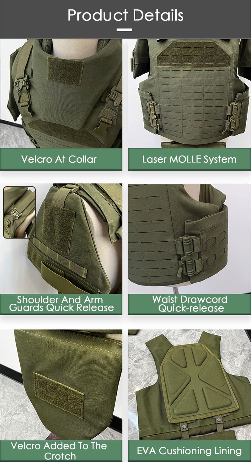 Compared with ordinary plate carrier that only protects the chest and back, the protective area of a full-protection plate carrier is further expanded, strengthening the protection of life-safety parts. No part is exposed except the head (a ballistic helmet can be used) and the limbs. Inserts are soft in texture, comfortable to wear, flexible in movement, excellent in elasticity, anti-aging, waterproof, moisture-proof, and UV-proof. They are the first line of protective equipment for frontline operations and duties.